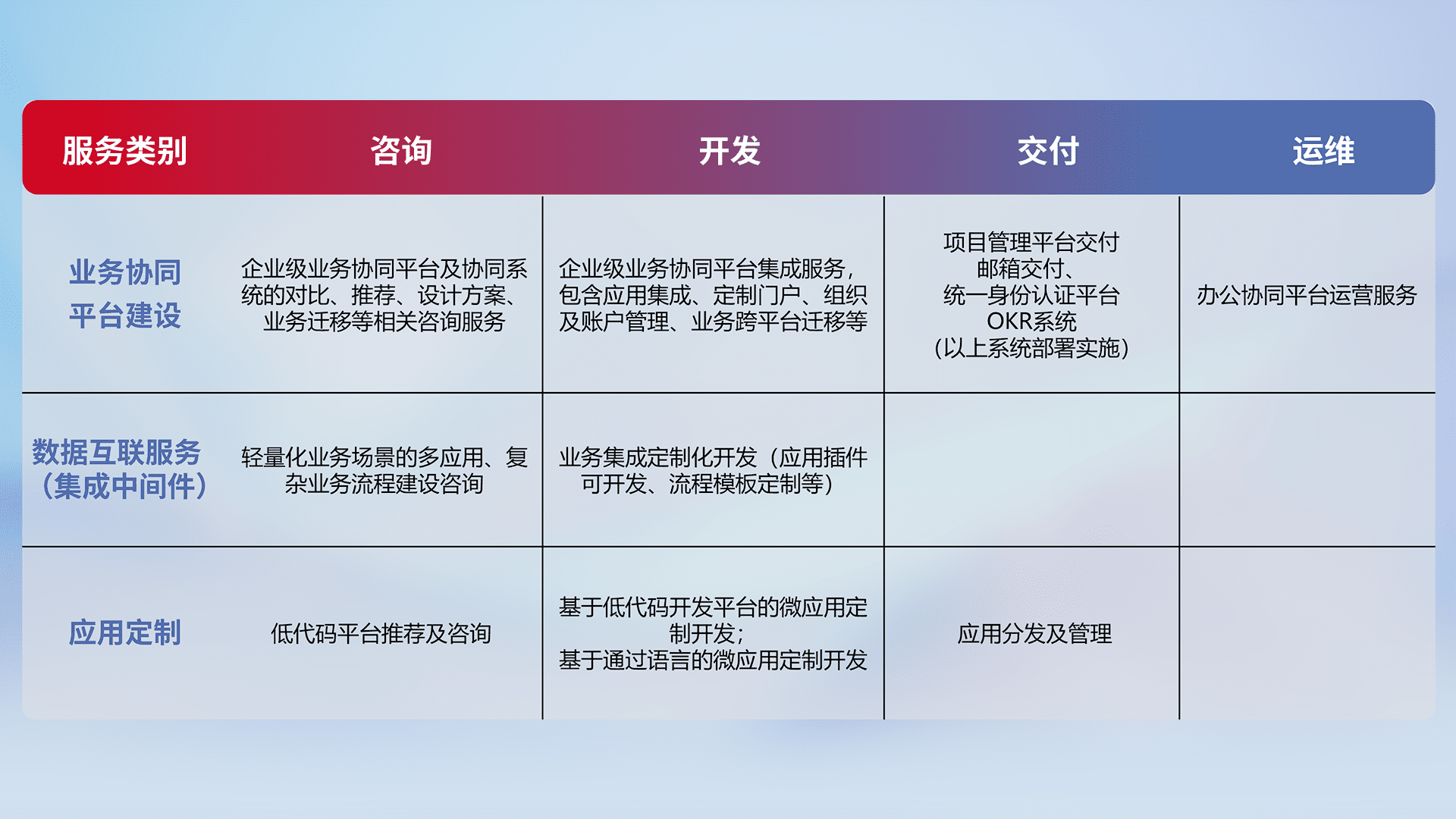 针对钉钉、、、、企微、、、IDaas等平台级产品提供产品的规划、、、方案、、、交付、、、、定制化开发等服务,,,实现如统一协同办公、、智能客户服务、、、、混合会议管理、、、、智能数据查询、、等业务场景,,,实现数字化转型。。。。