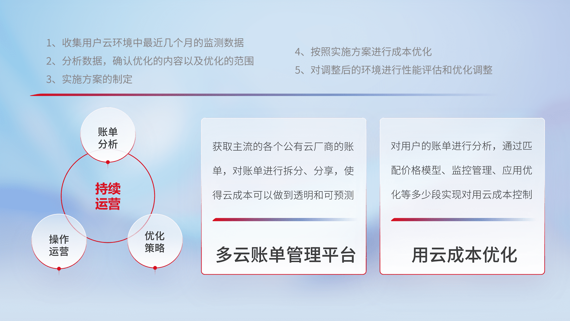 通过多云纳管,,,以统一的资源数据模型把客户的云资源进行抽象和封装,,进而实现对多云资源的统一操作,,,保障云资源管理的可靠性、、、、稳定性与可用性。。。。量身定制化运维内容,,,配置、、、开发运维、、补丁管理、、、、备份、、监控、、、认证和访问管理、、、、审计和日常巡检等,,,,保障在用云过程中的可靠度,,,稳定度以及高可用率。。。。