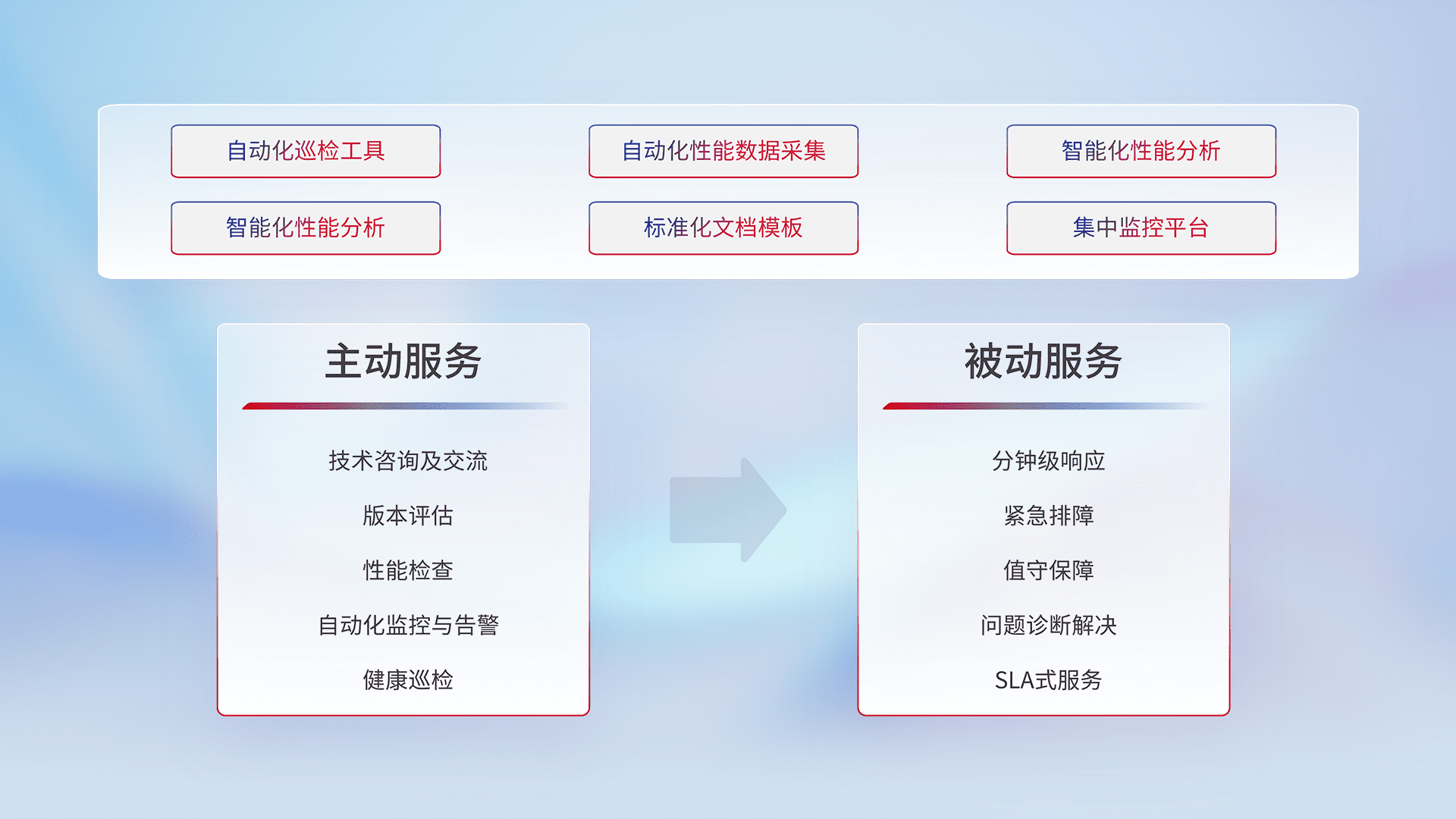 智能化工具和标准化文档,,保障服务质量,,,,提供主动服务(包含技术咨询、、版本评估、、、性能检查、、、、自动化监控与告警、、、健康巡检)和被动服务包含(分钟级响应、、紧急排障、、、值守保障、、问题诊断解决、、SLA服务)。。。。